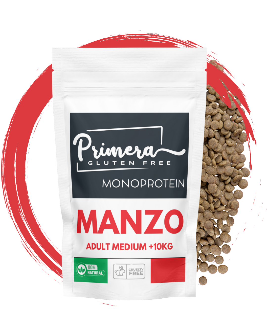 Manzo (di cui disidratato min. 30%, fresco min. 10%), riso (min. 15%), farina di piselli, oli e grassi animali stabilizzati, proteine idrolizzate di manzo, semi di lino (fonte di acidi grassi Omega 3 e Omega 6), polpa di barbabietola essiccata, yucca schidigera, sostanze minerali