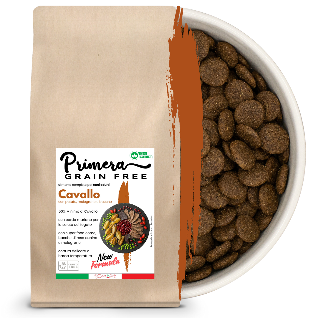 Carne di cavallo disidratata e fresca incluso fegato e frattaglie min. 50%, patate (min. 20%), farina di piselli, oli e grassi animali stabilizzati, semi di lino estrusi (fonte di acidi grassi Omega 3 e Omega 6), polpa di barbabietola essiccata, alghe marine essiccate (0,3%), FOS (fruttoligosaccaridi (0,2%), estratto secco di lievito 0,2% (fonte di MOS mannanoligosaccaridi), sostanze minerali, estratto di yucca schidigera (200 mg/kg), cardo mariano in polvere (200 mg/kg), melograno disidratato (200 mg/kg), bacche di rosa canina in polvere (20 mg/kg)