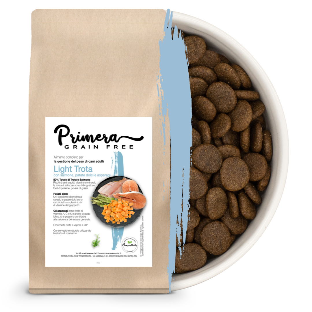 Trota e salmone 50% (comprendente trota cucinata al momento 30%, salmone disidratato 11%, salmone cucinato al momento 4%, olio di salmone 3%, brodo di salmone 2%), patate dolci (24%), patate, piselli (6%), polpa di barbabietola, proteina di pisello, semi di lino, minerali, asparagi (0,3%), glucosamina (170 mg/kg), metilsulfonilmetano (170 mg/kg), condroitina solfato (125 mg/kg), fruttooligosaccaridi (FOS 96 mg/kg), mannanoligosaccaridi (MOS 24 mg/kg)