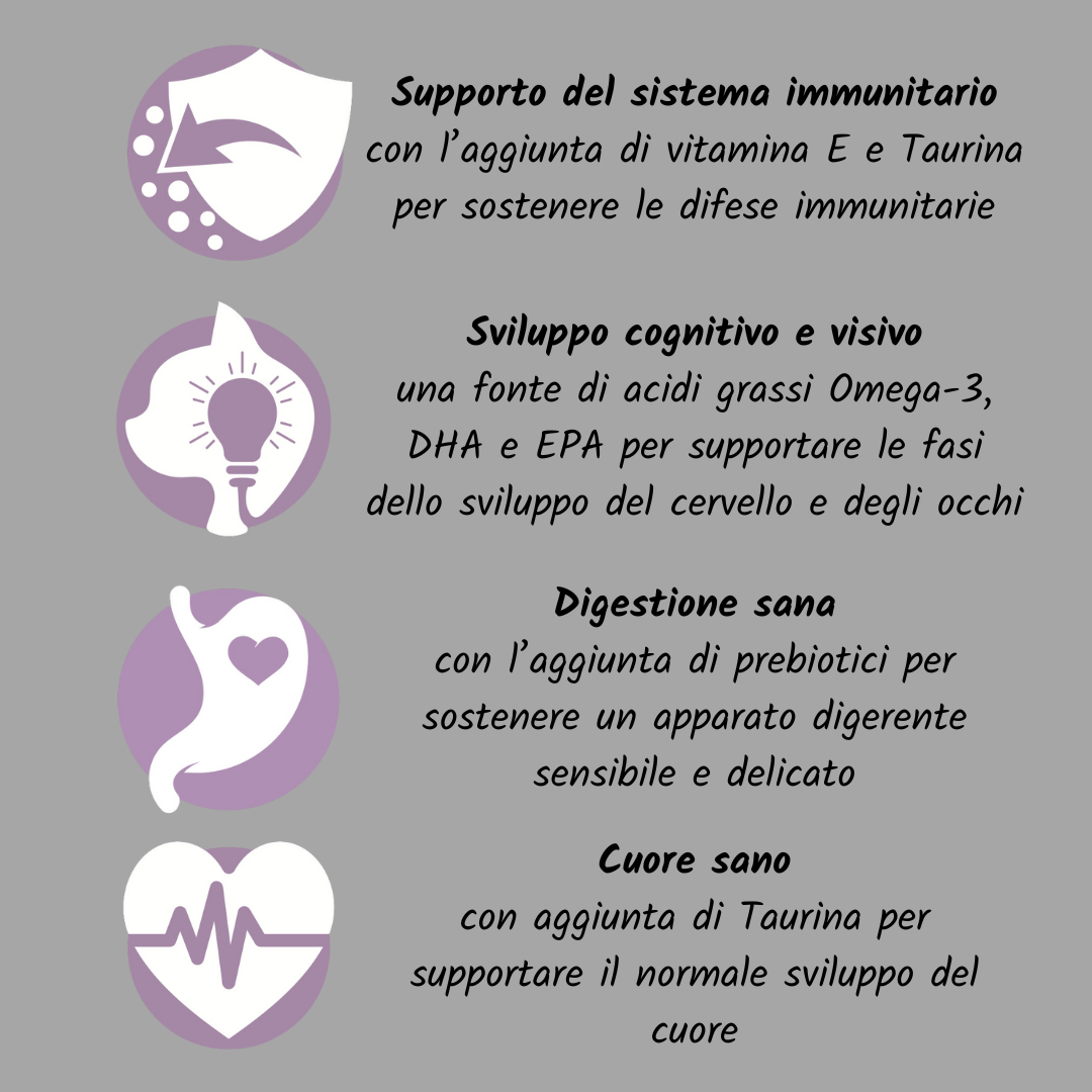 Tacchino e pollo 70% (comprendente pollo disidratato 36%, tacchino disossato cucinato al momento 30%, grasso di tacchino 4%), patate, piselli, ceci, lenticchie, salsa di fegato idrolizzato, olio di salmone, cellulosa, minerali, fruttooligosaccaridi (FOS 480 mg/kg), mannanoligosaccaridi (MOS 120 mg/kg), mirtillo rosso disidratato, estratto di yucca (180 mg/kg)
