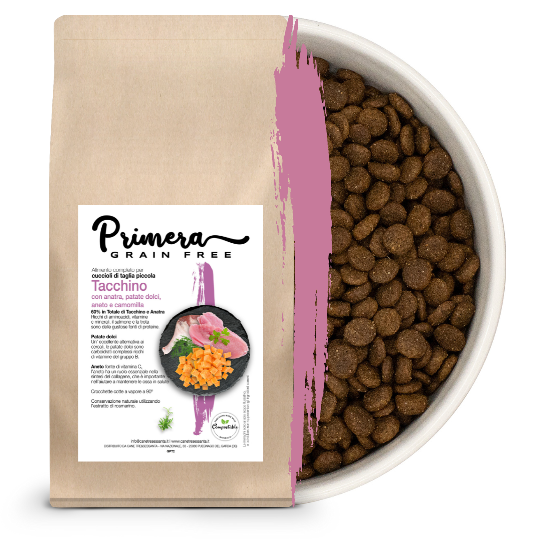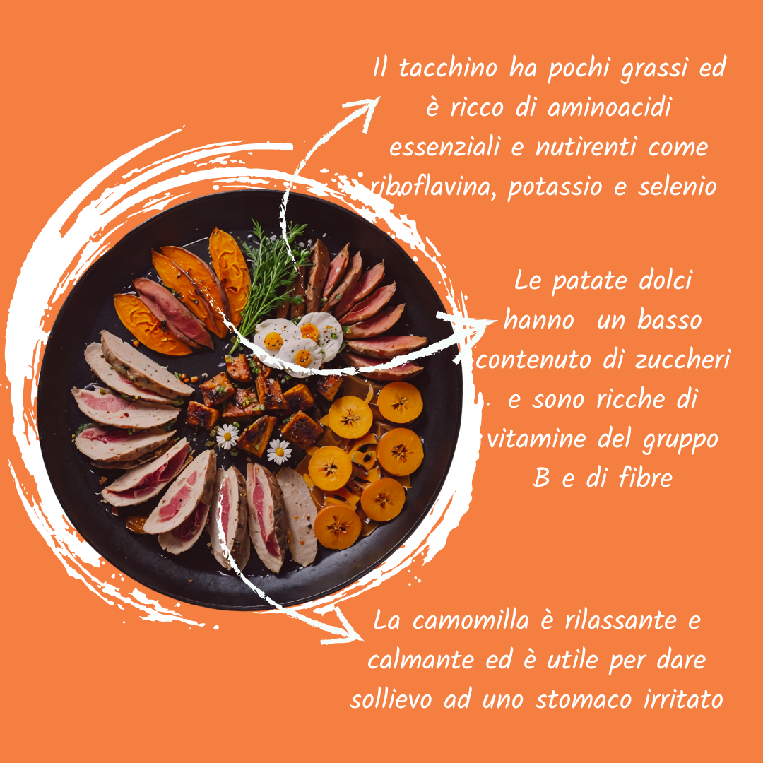 Tacchino e anatra 60% (compreso tacchino cucinato al momento 32%, tacchino disidratato 18%, grasso di tacchino 5%, anatra cucinata al momento 4% e brodo di tacchino 1%), patate dolci (20%), proteine delle patate, piselli (4%), patate, polpa di barbabietola, semi di lino, minerali, integratore Omega 3, brodo vegetale, camomilla (0,3%), aneto (0,3%), nucleotidi, glucosamina (170 mg/kg), metilsulfonilmetano (170 mg/kg), condroitina solfato (125 mg/kg), fruttooligosaccaridi (FOS 96 mg/kg), mannanoligosaccaridi (MOS (24 mg/kg)